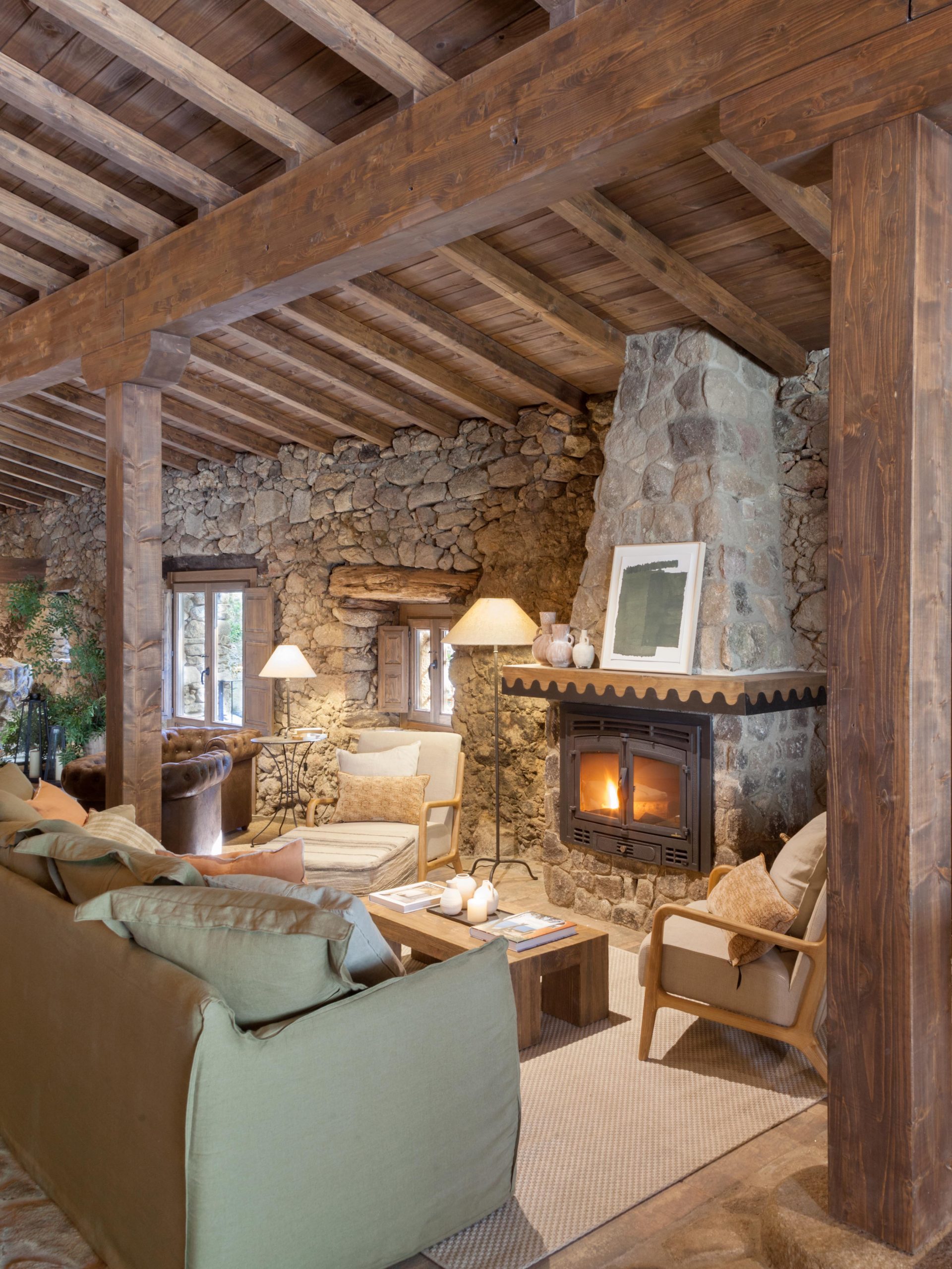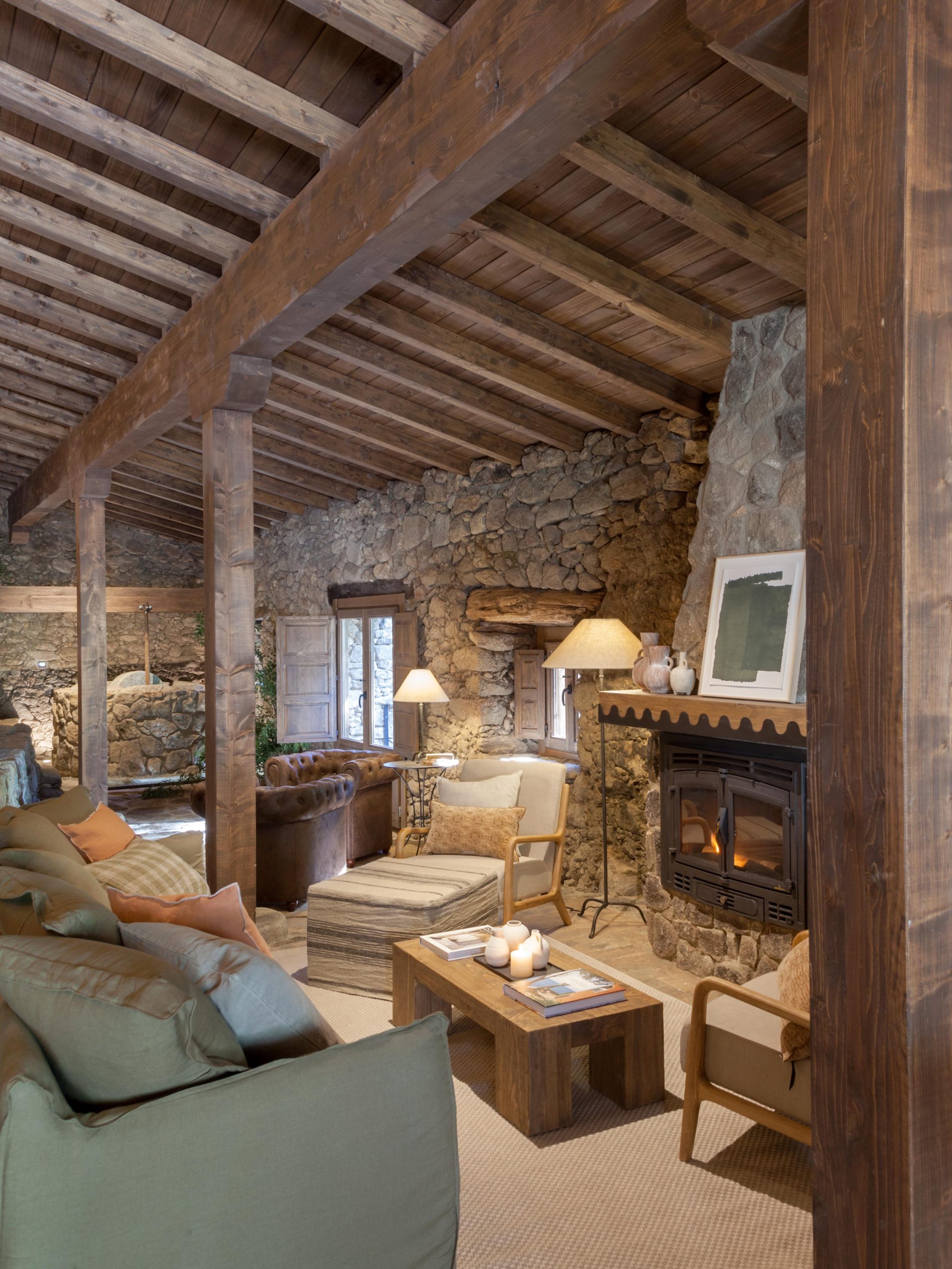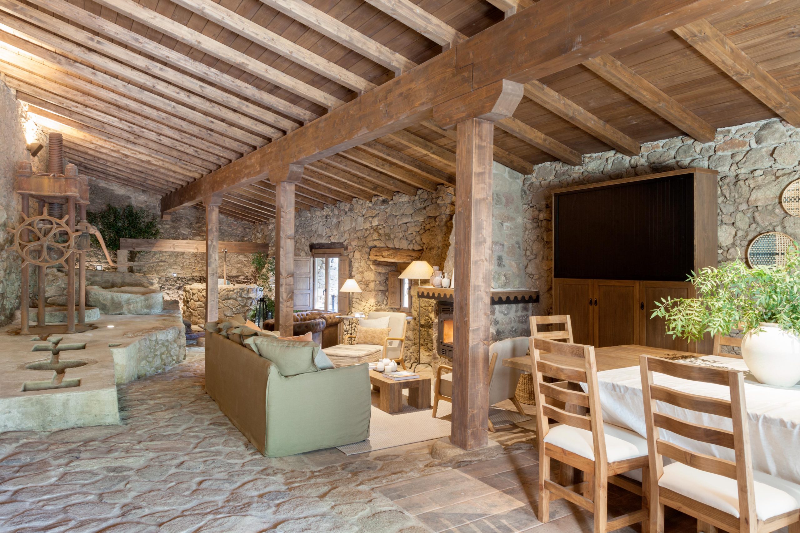 - Servicios Adaptado a personas con discapacidad (1 habitación), Baño: ducha (7), bañera de piedra, jacuzzi, secador de pelo (7), papel higiénico y amenities de cortesía, Botiquin, Calefacción: chimenea interior (2), suelo radiante-refrigerante (geotermia) y a/c frío-calor, Cocina (2): cafetera (italiana y de cápsulas), frigorifico combi, exprimidor, hervidor, horno, lavavajillas, microondas, batidora, plancha, tostadora y vitrocerámica, Cuna de viaje, Disponibilidad de camas supletorias (4 - aumenta capacidad hasta 18pax), Disponibilidad de servicio de limpieza diario, Dormitorio y lavanderia: almohadas (adicionales también), toallas, ropa de cama, mantas (adicionales también), lavadora, plancha y perchas, Exterior: tumbonas, cama balinesa, mobiliario, barra con refrigeradores/congelador, horno de leña con menaje, barbacoa de carbón/leña y paellera de gas con paelleras (19p, 12p y 5p), Extintor de incendios, leña de cortesía, Menaje (2): cazuelas, sartenes, platos, cubiertos, copas de vino y olla gigante, Se admiten mascotas, Trona, TV, Wifi, Zona para trabajar